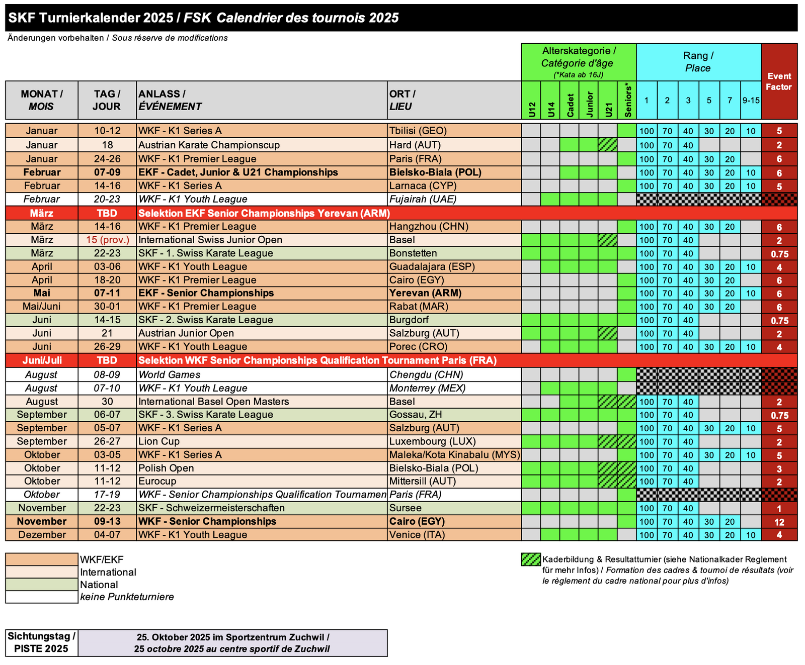 Attention: certaines manifestations peuvent être déplacées ou annulées. Vérifiez donc toujours auparavant la validité de la date de la compétition avec votre entraineur ou votre point de soutien.