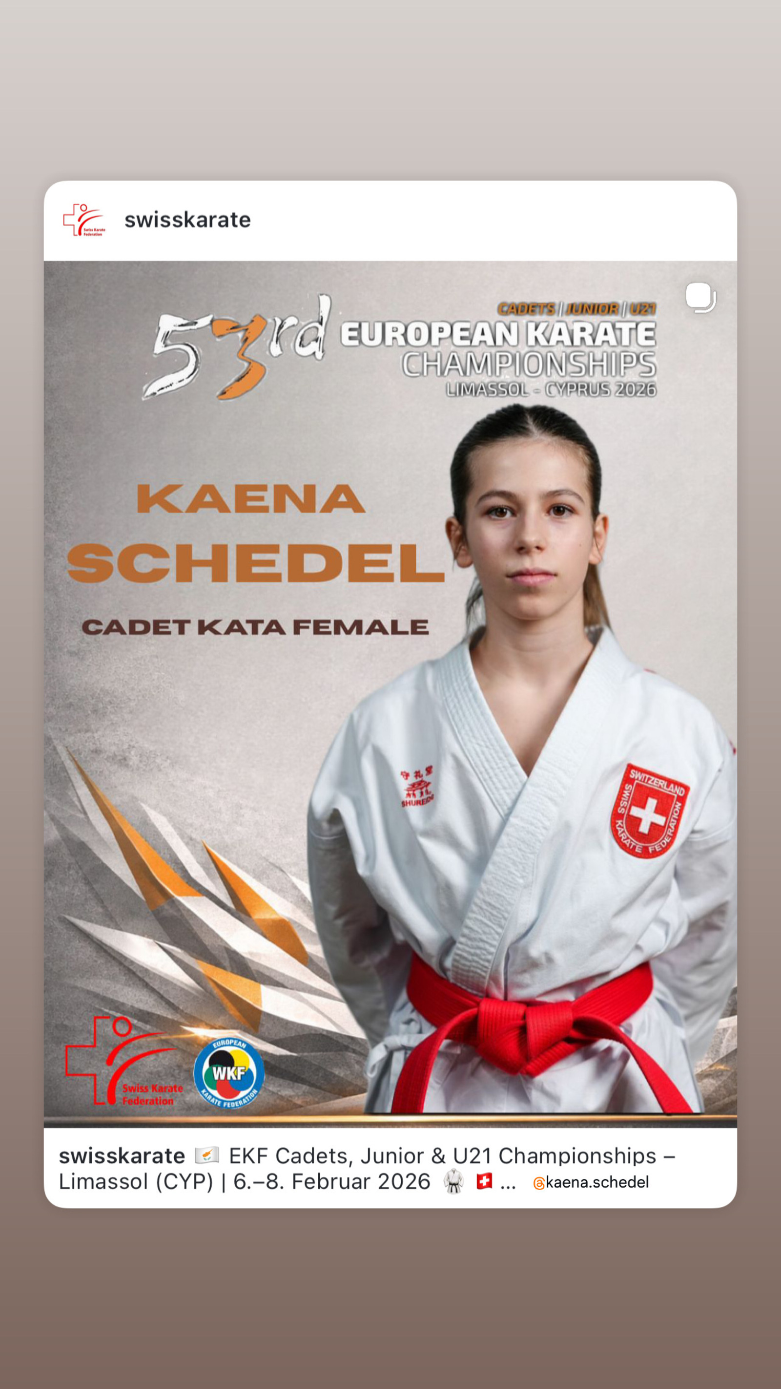 A peine de retour des Championnats du Monde, Kaena Schedel (SUI) décroche sa sélection suisse pour aller représenter son pays lors des prochains Championnats d'Europe 2025 dans la catégorie technique hautement exigeante que sont les katas (Kata Cadets, Filles de moins de 16 ans). Les Championnats d'Europe de karaté organisés par la European Karate Federation (EKF) et se dérouleront durant toute la première semaine de février 2025 en Pologne pour les cadets, juniors et les sportifs moins de 21 ans. Durant les sélections officielles 2024 de la Fédération Suisse de Karaté, Kaena obtient 475 point de qualifications du classement, avec plus de 200 points d'avance sur ses concurrentes nationales directes. Un immense Bravo à cette sportive pour cette nouvelle qualification internationale !
