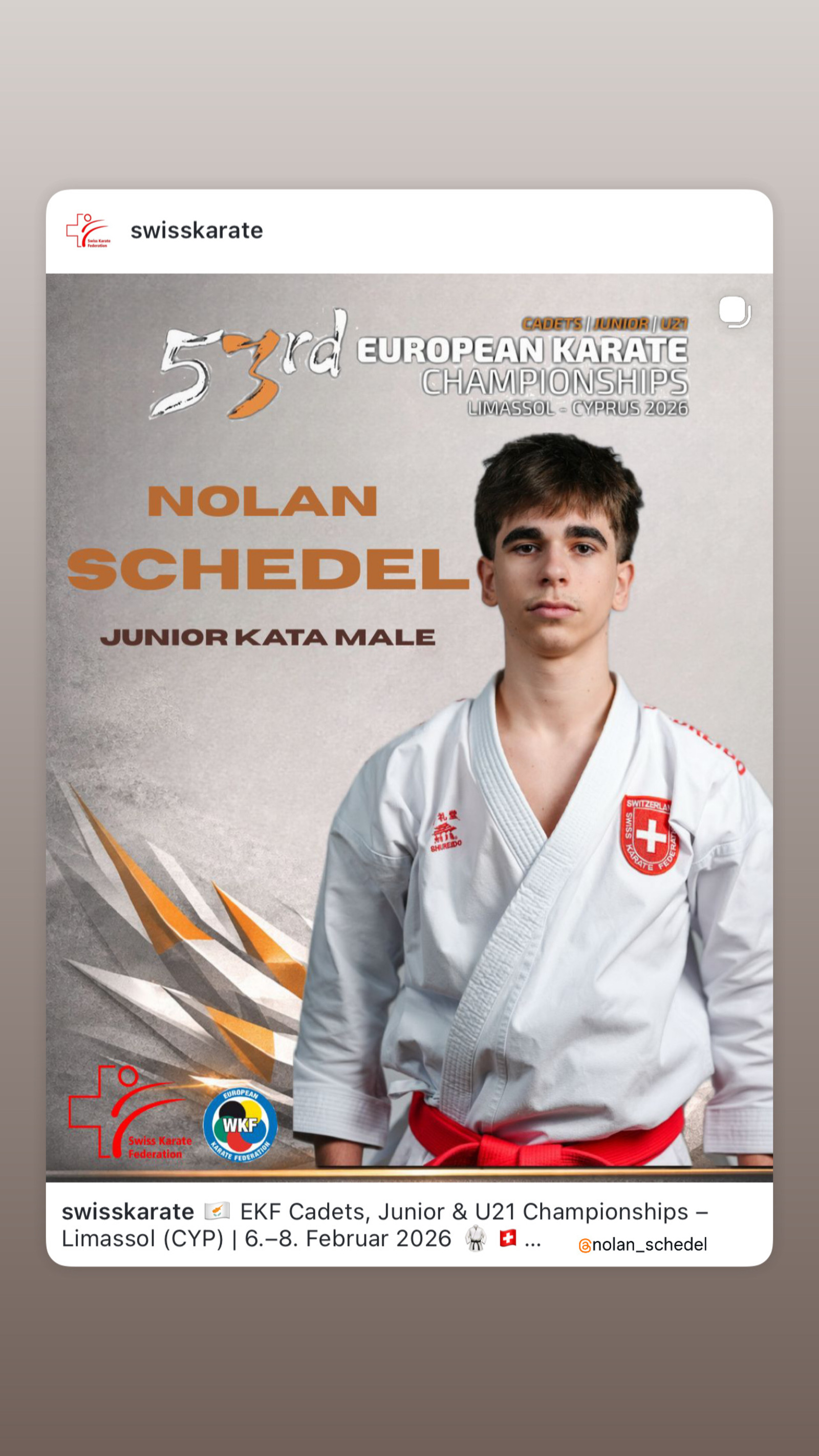 Nolan Schedel (SUI - Kata, Junior Male), prendra la 9ème place de ces Championnats d'Europe 2026. Nolan entre solide dans ce championnat malgré un tirage difficile cette année pour toute la délégation suisse. Il s'inclinera sur le tatami face à l'espagnol tête de série de sa catégorie qui deviendra le champion d'Europe en titre. Cependant, l'espagnol concéder une décision en faveur de ce sportif suisse reçue par les juges européens. En repêchages, la progression de Nolan fut stoppé ensuite de justesse contre le Danemark sur une décision arbitrale difficile qui reste en travers de la gorge car Nolan avait largement le potentiel de se distinguer en vue d'accéder au match pour le bronze.